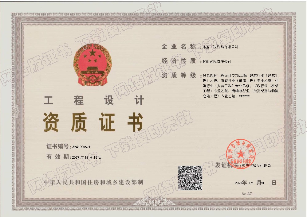 建基工程咨詢有限公司具備建筑工程設(shè)計(jì)資質(zhì)證書,資質(zhì)證書等級為風(fēng)景園林工程設(shè)計(jì)專項(xiàng)級;建筑行業(yè)(建筑工程)乙級;市政行業(yè) (道路工程) 專業(yè)乙級;建筑行業(yè) (人防工程) 專業(yè)乙級:市政行業(yè)(橋梁工程) 專業(yè)乙級;商物糧行業(yè)(批發(fā)配送與物流倉儲(chǔ)工程